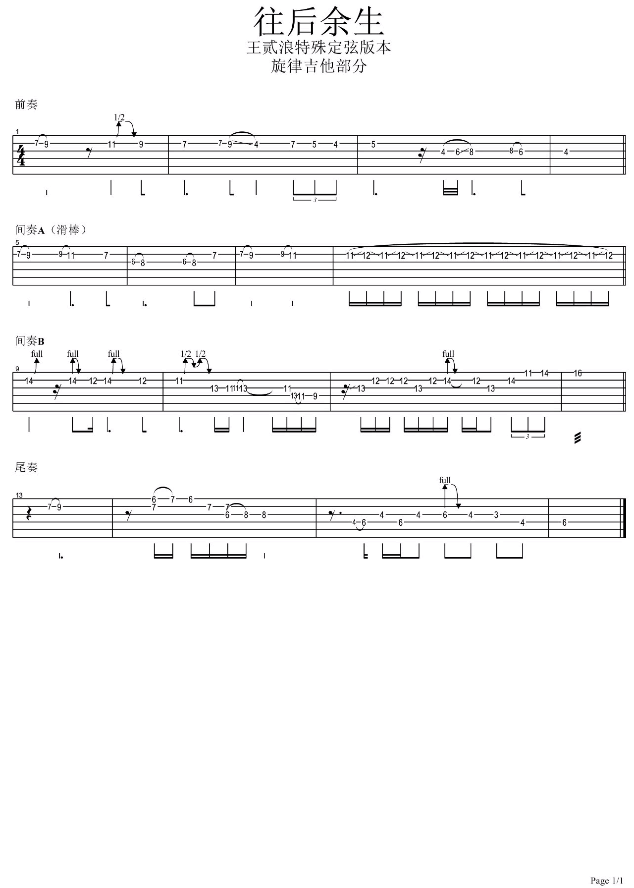 往后余生吉他谱,王贰浪特殊定弦版本,编配说明:《往后余生》是马良词曲的一首民谣风格歌曲,也算是抖音上的热门歌曲之一。今年有一个现象,就是抖音这个短视频APP引领了热门流行歌曲的方向。既然是热门歌曲,那么就少不了有人翻唱,而众多翻唱版本当中,被誉为最好听的女生翻唱就是王贰浪的这个版本,整首歌经过重新的编曲带来了另一种感觉。到网上搜索了一下,没有查到任何关于这个版本的资料,几乎清一色的都是C调指法的编配,于是决定自己去扒谱。《往后余生》吉他弹唱特殊调弦版这首歌吉他部分采用了OPENB的特殊定弦方式,由于定弦方式的改变带来了不同的和声效果,解放出来的手指还可以弹奏泛音作为点缀。视频当中伴奏部分基本上还原了原曲的弹法,间奏的部分我适当的做了一些小小的改动,使用了滑棒,加入了人声和一段4小节的SOLO。演唱部分的调式是原曲的B调,非常适合女生来唱。由于找不到女歌手,我只好自己来唱,所以会觉得整体声音比较低沉。