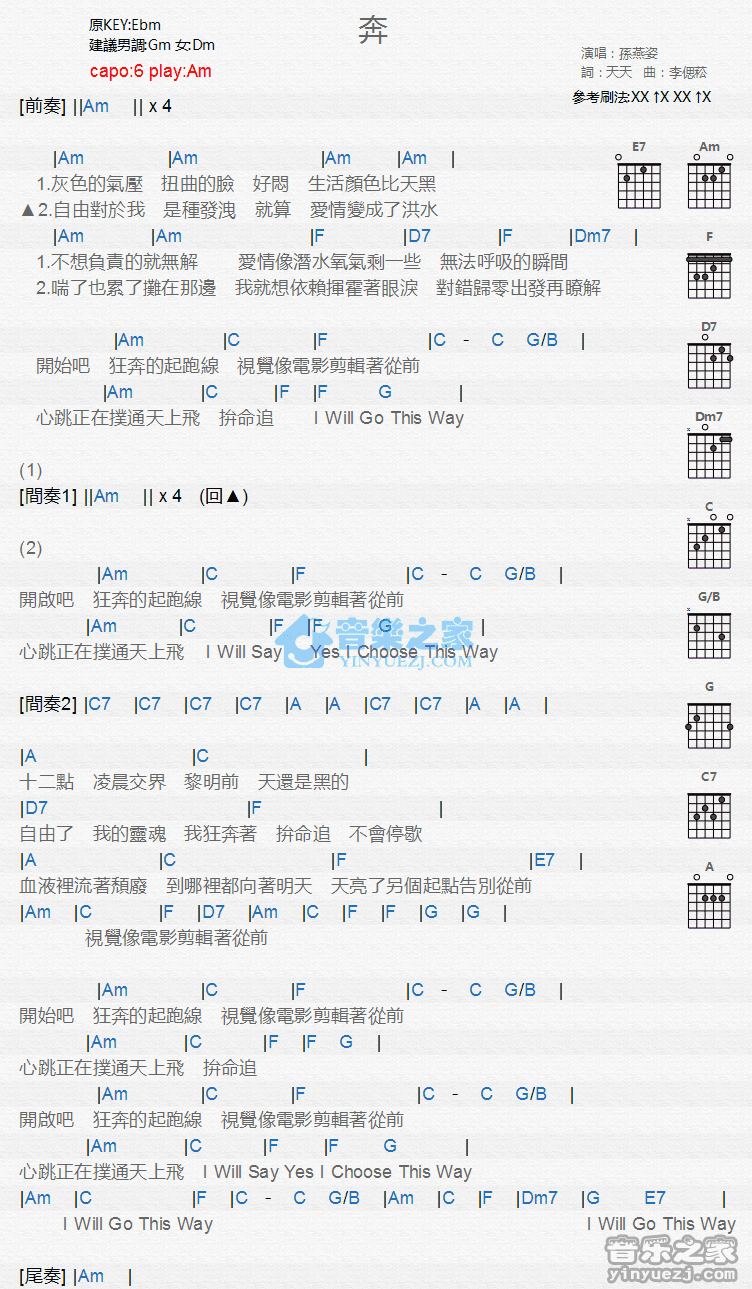 奔吉他谱_吉他弹唱谱_孙燕姿 • 更新时间:2025-10-08 •阅读 96 Am调版 孙燕姿《奔》吉他和弦弹唱谱 奔吉他谱_吉他弹唱谱_孙燕姿 - 第1张 免责声明:本文版权归属,本站不对其内容的准确性给予任何承诺,收录仅供读者参考。如本文侵犯了您的合法权益,请及时联系本站,我们将在24小时内删除处理。本文链接:https://www.jitamao.com/pu/8787.html