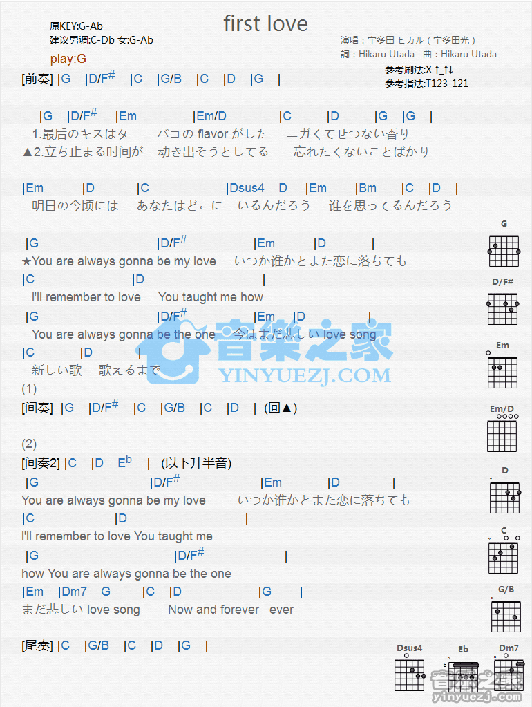 First Love吉他谱_吉他弹唱谱_宇多田光_YYZJ编配 YYZJ • 更新时间:2025-10-09 •阅读 79 G调版《FirstLove》吉他和弦弹唱谱 First Love吉他谱_吉他弹唱谱_宇多田光_YYZJ编配 - 第1张 免责声明:本文版权归属YYZJ,本站不对其内容的准确性给予任何承诺,收录仅供读者参考。如本文侵犯了您的合法权益,请及时联系本站,我们将在24小时内删除处理。本文链接:https://www.jitamao.com/pu/8788.html