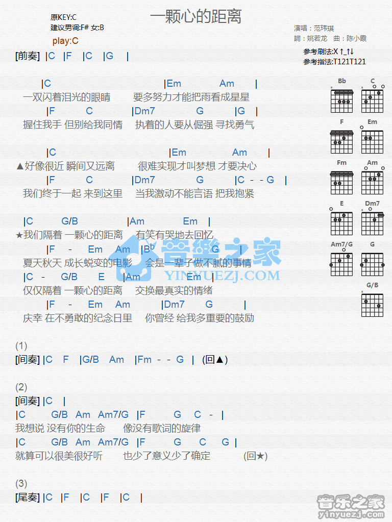 一颗心的距离吉他谱_吉他弹唱谱_范玮琪_YYZJ编配 YYZJ • 更新时间:2025-10-14 •阅读 9 C调版《一颗心的距离》吉他和弦弹唱谱 一颗心的距离吉他谱_吉他弹唱谱_范玮琪_YYZJ编配 - 第1张 免责声明:本文版权归属YYZJ,本站不对其内容的准确性给予任何承诺,收录仅供读者参考。如本文侵犯了您的合法权益,请及时联系本站,我们将在24小时内删除处理。本文链接:https://www.jitamao.com/pu/8793.html