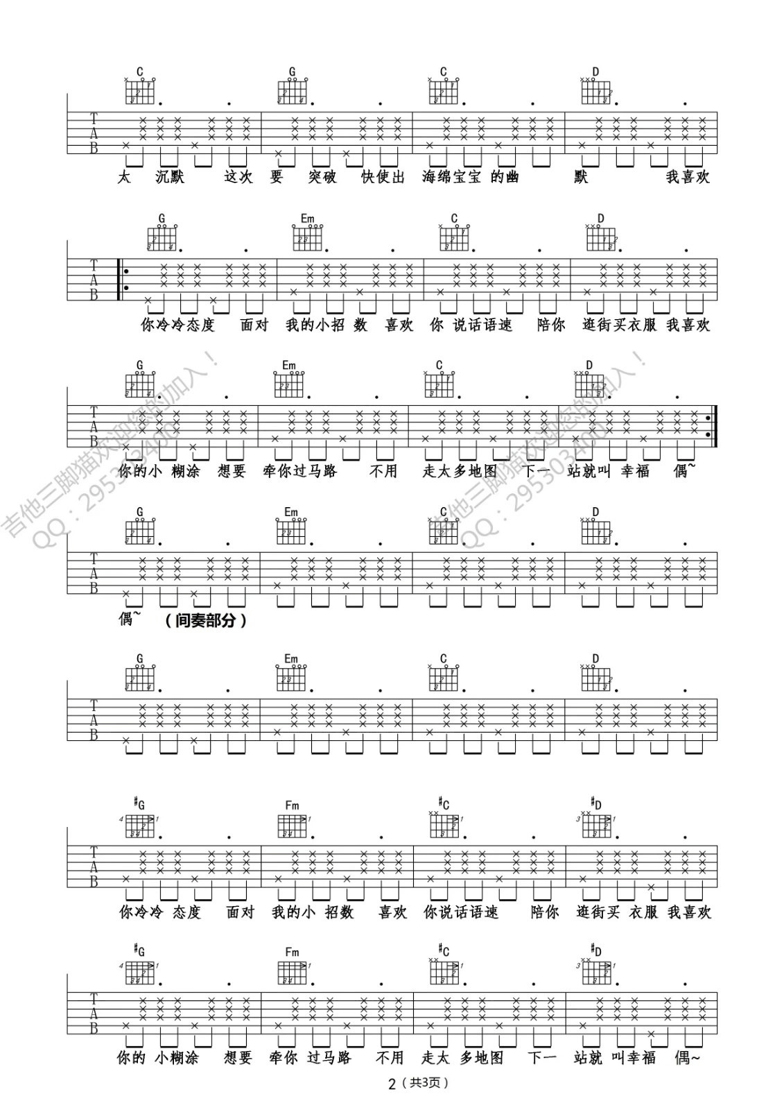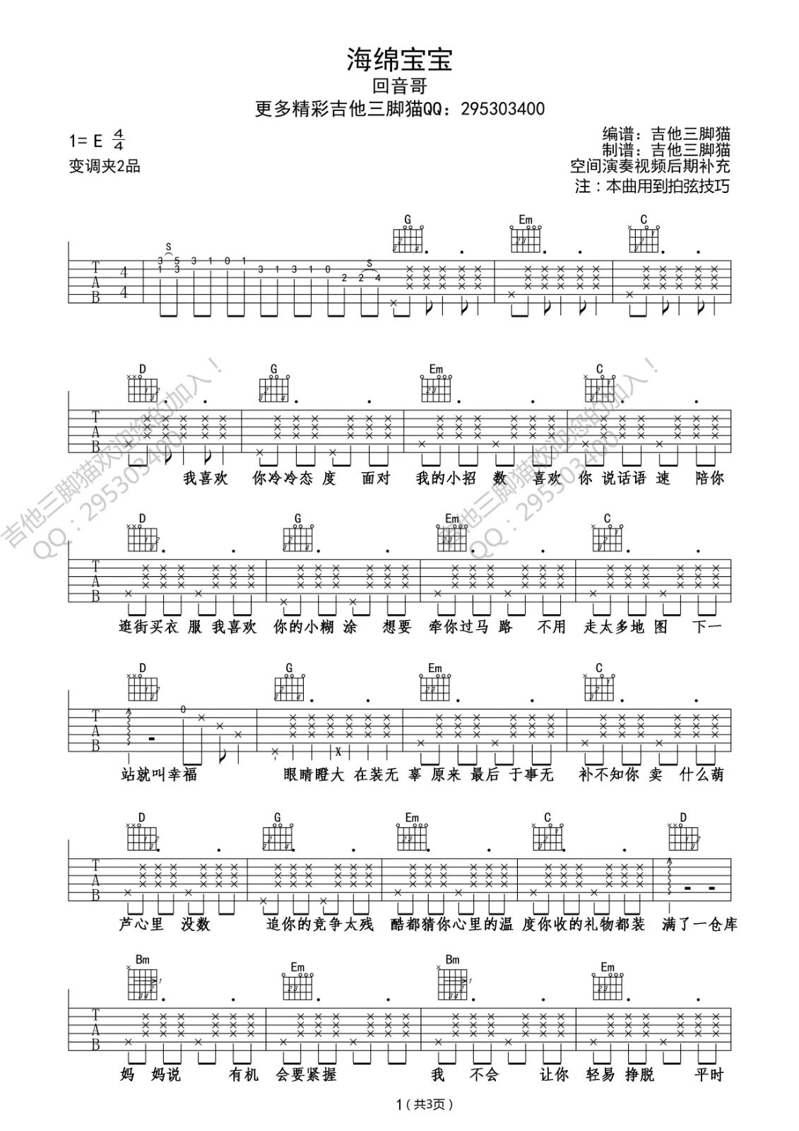 海绵宝宝吉他谱_吉他弹唱谱_回音哥_吉他三脚猫编配 吉他三脚猫 • 更新时间:2025-10-17 •阅读 146 海绵宝宝吉他弹唱谱,变调夹夹第二品。高手在民间,面具歌手回音哥唱的一首好听的情歌《海绵宝宝》,轻快的旋律,甜蜜的歌词。听后总感觉会上瘾,就算不好的心情也会变温柔。 海绵宝宝吉他谱_吉他弹唱谱_回音哥_吉他三脚猫编配 - 第1张 海绵宝宝吉他谱_吉他弹唱谱_回音哥_吉他三脚猫编配 - 第2张 海绵宝宝吉他谱_吉他弹唱谱_回音哥_吉他三脚猫编配 - 第3张 免责声明:本文版权归属吉他三脚猫,本站不对其内容的准确性给予任何承诺,收录仅供读者参考。如本文侵犯了您的合法权益,请及时联系本站,我们将在24小时内删除处理。本文链接:https://www.jitamao.com/pu/8796.html
