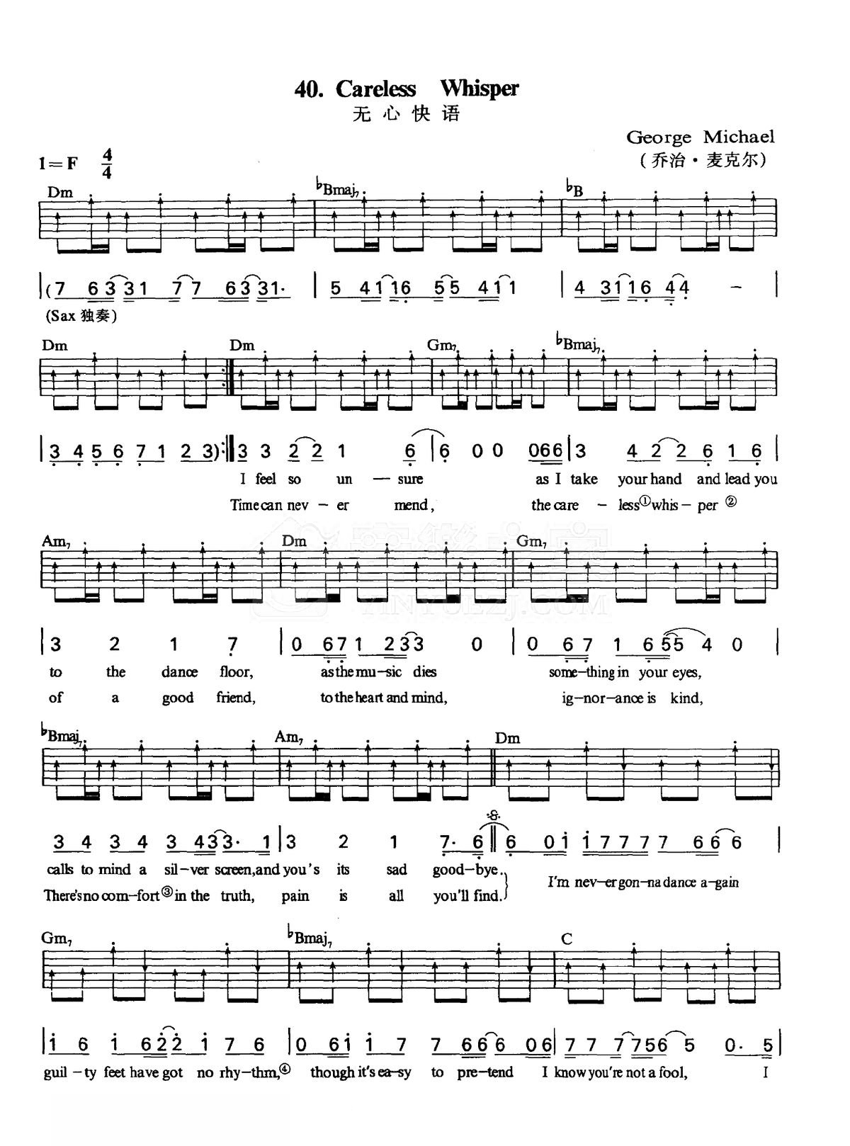 F调版《CarelessWhisper》吉他弹唱六线谱