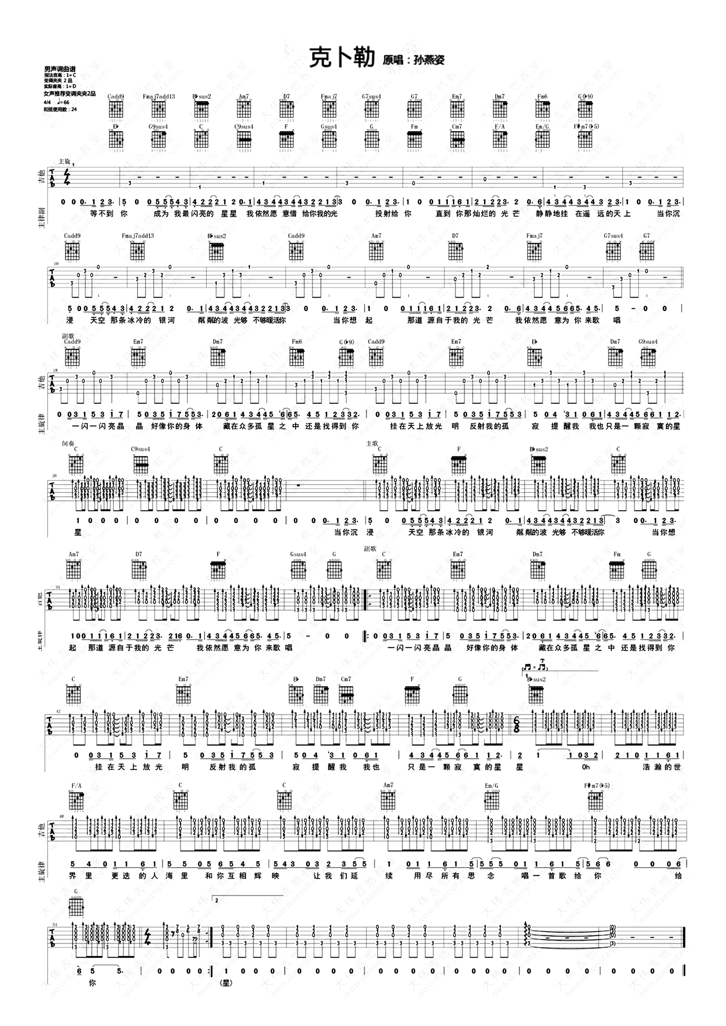 克卜勒吉他谱_吉他弹唱谱_孙燕姿_大伟吉他编配 大伟吉他 • 更新时间:2025-11-04 •阅读 53 克卜勒吉他谱,孙燕姿演唱的一首歌曲,克卜勒吉他弹唱谱,使用C调指法,原调D,变调夹夹2品,从天黑黑时启航,到克卜勒在夜空星光熠熠的闪亮,孙燕姿收敛清冷,浅吟低唱,为你唱来自一颗星星的梦,近在耳畔的温柔呢喃,化作诗意羽翼,治愈温暖,抚慰你的软肋旧伤。 克卜勒吉他谱_吉他弹唱谱_孙燕姿_大伟吉他编配 - 第1张 免责声明:本文版权归属大伟吉他,本站不对其内容的准确性给予任何承诺,收录仅供读者参考。如本文侵犯了您的合法权益,请及时联系本站,我们将在24小时内删除处理。本文链接:https://www.jitamao.com/pu/8814.html