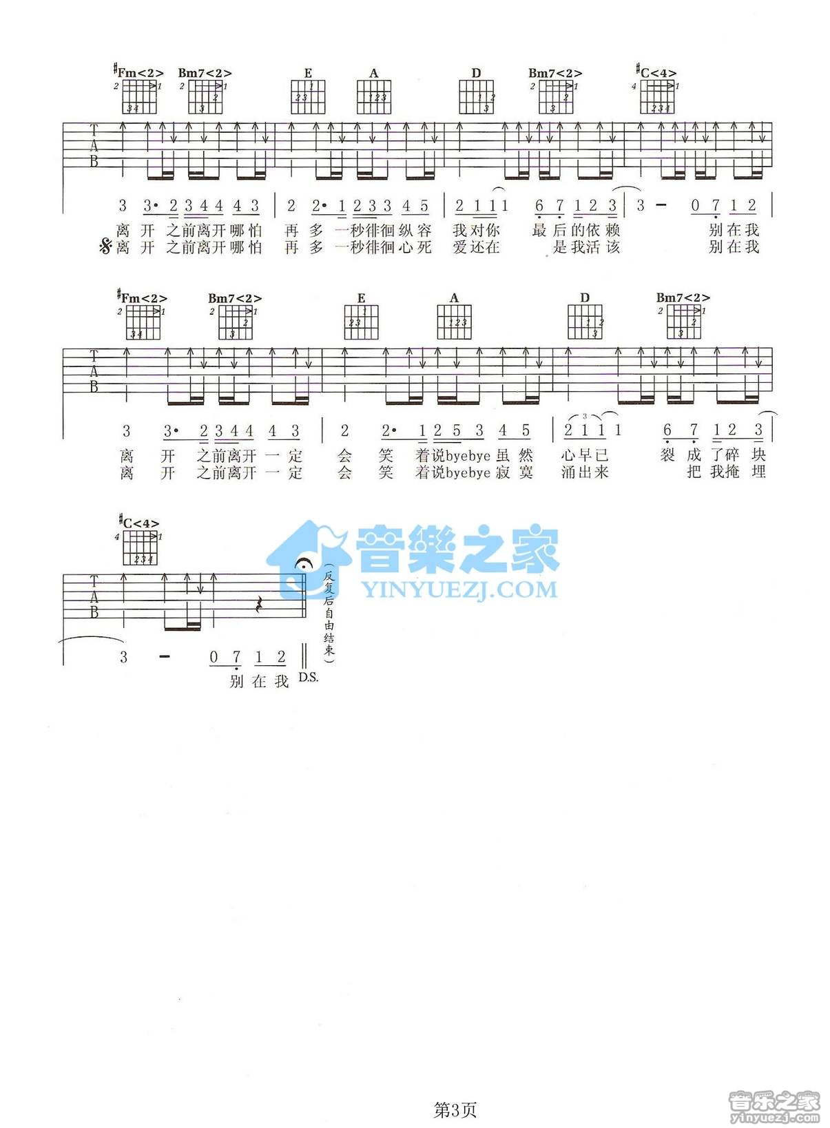 别在我离开之前离开吉他谱_吉他弹唱谱_雷诺儿 • 更新时间:2025-12-19 •阅读 27 A调版雷诺儿《别在我离开之前离开》吉他弹唱六线谱 别在我离开之前离开吉他谱_吉他弹唱谱_雷诺儿 - 第1张 别在我离开之前离开吉他谱_吉他弹唱谱_雷诺儿 - 第2张 别在我离开之前离开吉他谱_吉他弹唱谱_雷诺儿 - 第3张 免责声明:本文版权归属,本站不对其内容的准确性给予任何承诺,收录仅供读者参考。如本文侵犯了您的合法权益,请及时联系本站,我们将在24小时内删除处理。本文链接:https://www.jitamao.com/pu/8859.html