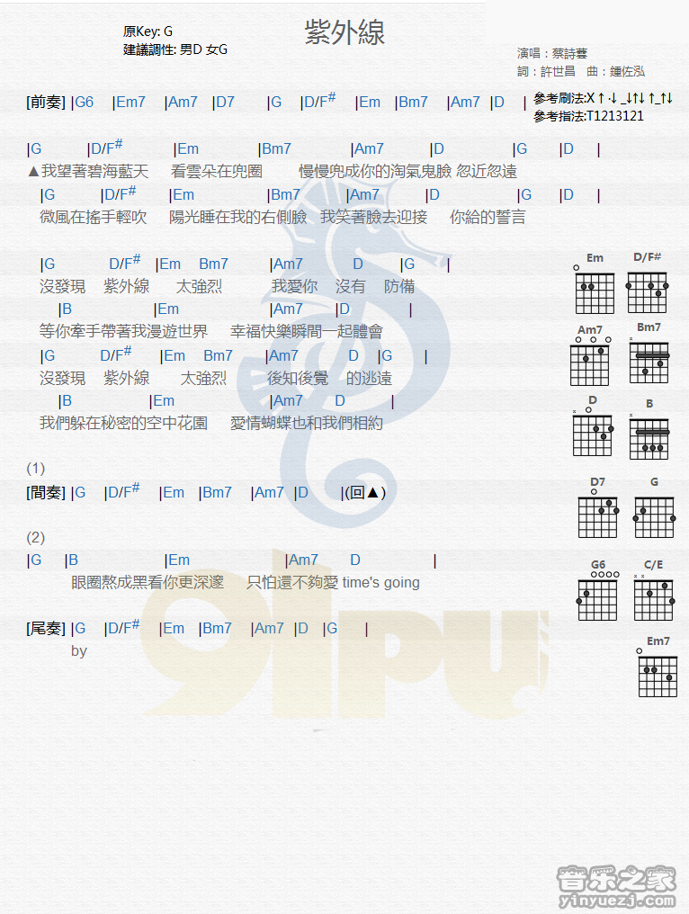 紫外线吉他谱_吉他弹唱谱_蔡诗芸_YYZJ编配 YYZJ • 更新时间:2026-01-05 •阅读 72 G调版《紫外线》吉他和弦弹唱谱 紫外线吉他谱_吉他弹唱谱_蔡诗芸_YYZJ编配 - 第1张 免责声明:本文版权归属YYZJ,本站不对其内容的准确性给予任何承诺,收录仅供读者参考。如本文侵犯了您的合法权益,请及时联系本站,我们将在24小时内删除处理。本文链接:https://www.jitamao.com/pu/8875.html