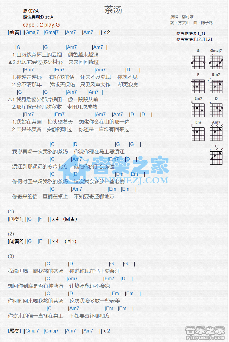 茶汤吉他谱_吉他弹唱谱_郁可唯 • 更新时间:2026-01-17 •阅读 60 G调版郁可唯《茶汤》吉他和弦弹唱谱 茶汤吉他谱_吉他弹唱谱_郁可唯 - 第1张 免责声明:本文版权归属,本站不对其内容的准确性给予任何承诺,收录仅供读者参考。如本文侵犯了您的合法权益,请及时联系本站,我们将在24小时内删除处理。本文链接:https://www.jitamao.com/pu/8886.html
