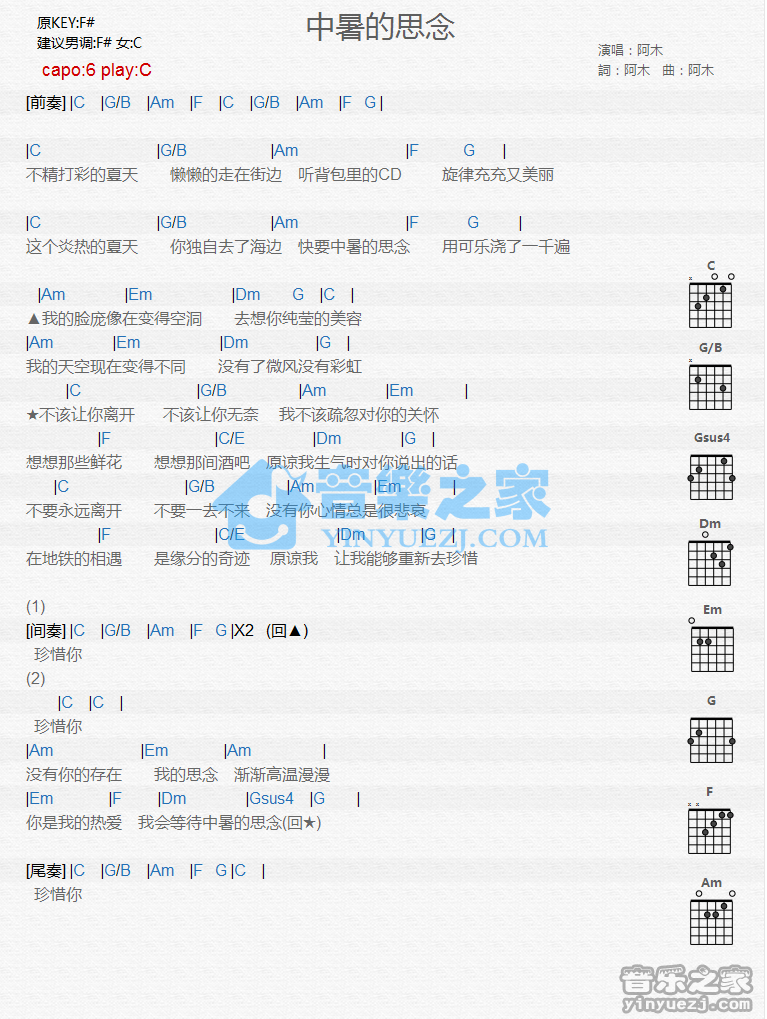 中暑的思念吉他谱_吉他弹唱谱_阿木 • 更新时间:2026-02-09 •阅读 85 C调版 阿木《中暑的思念》吉他和弦弹唱谱 中暑的思念吉他谱_吉他弹唱谱_阿木 - 第1张 免责声明:本文版权归属,本站不对其内容的准确性给予任何承诺,收录仅供读者参考。如本文侵犯了您的合法权益,请及时联系本站,我们将在24小时内删除处理。本文链接:https://www.jitamao.com/pu/8909.html