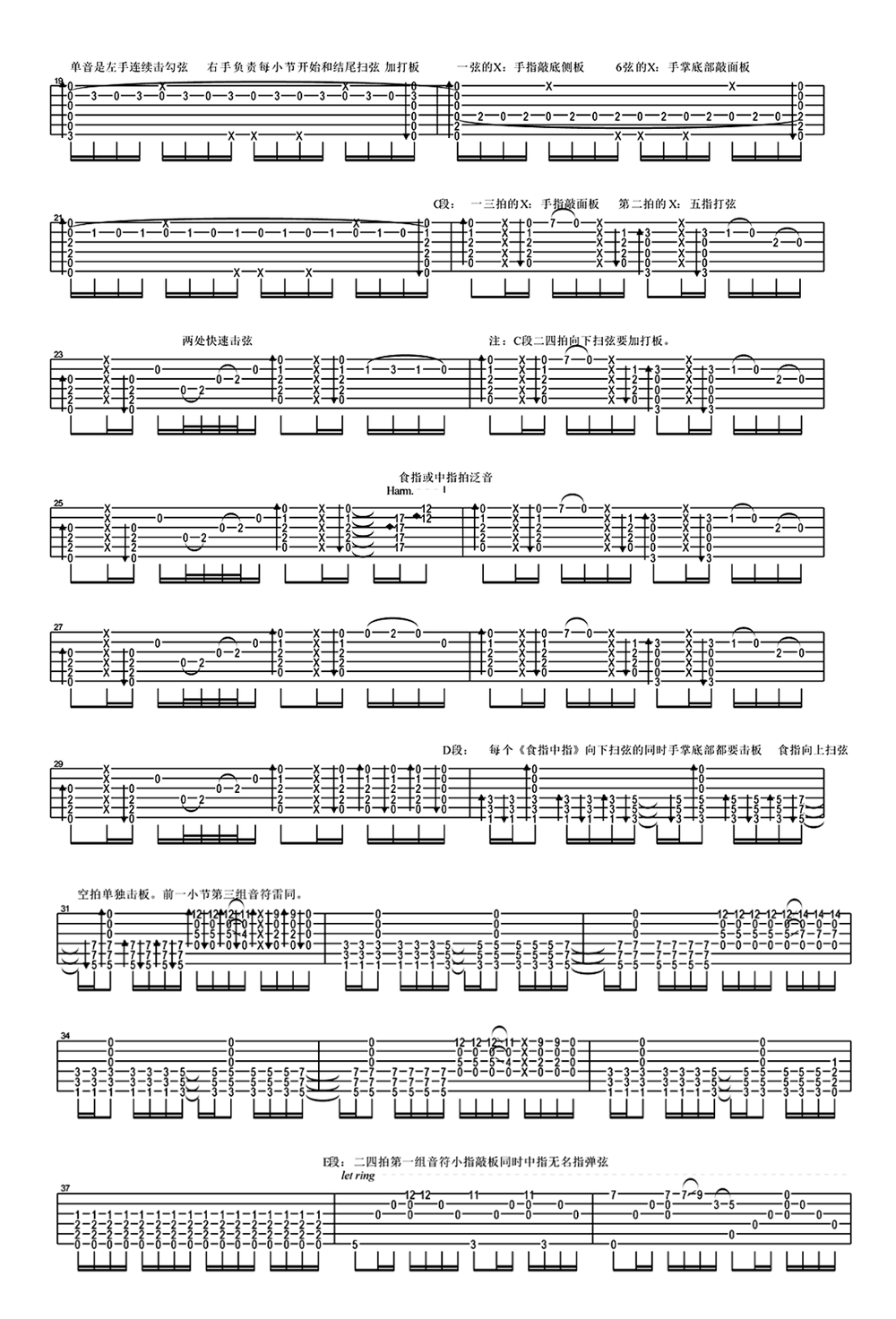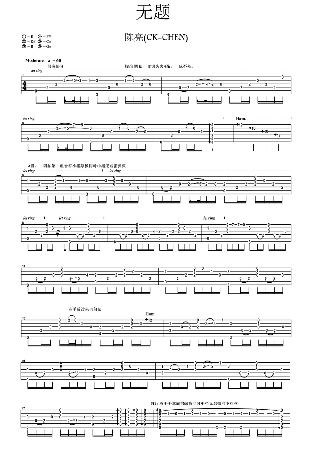陈亮无题吉他谱,一首中国风的指弹曲,无题指弹谱,六线谱完整版编配,共五张图片谱分两页呈现。指弹谱若是不对一些技巧加以标注说明,很难弹正确,有些信息是谱子本身没法表达的;同样,指弹谱若是没有简谱、和弦,音乐素养欠缺的朋友就很难理解曲子,顶多只是死记了六线谱而已,当你能从音乐深度上理解一首作品时,才能更好地去处理、表达它,也才能提高自己的音乐素养、积累音乐素材。